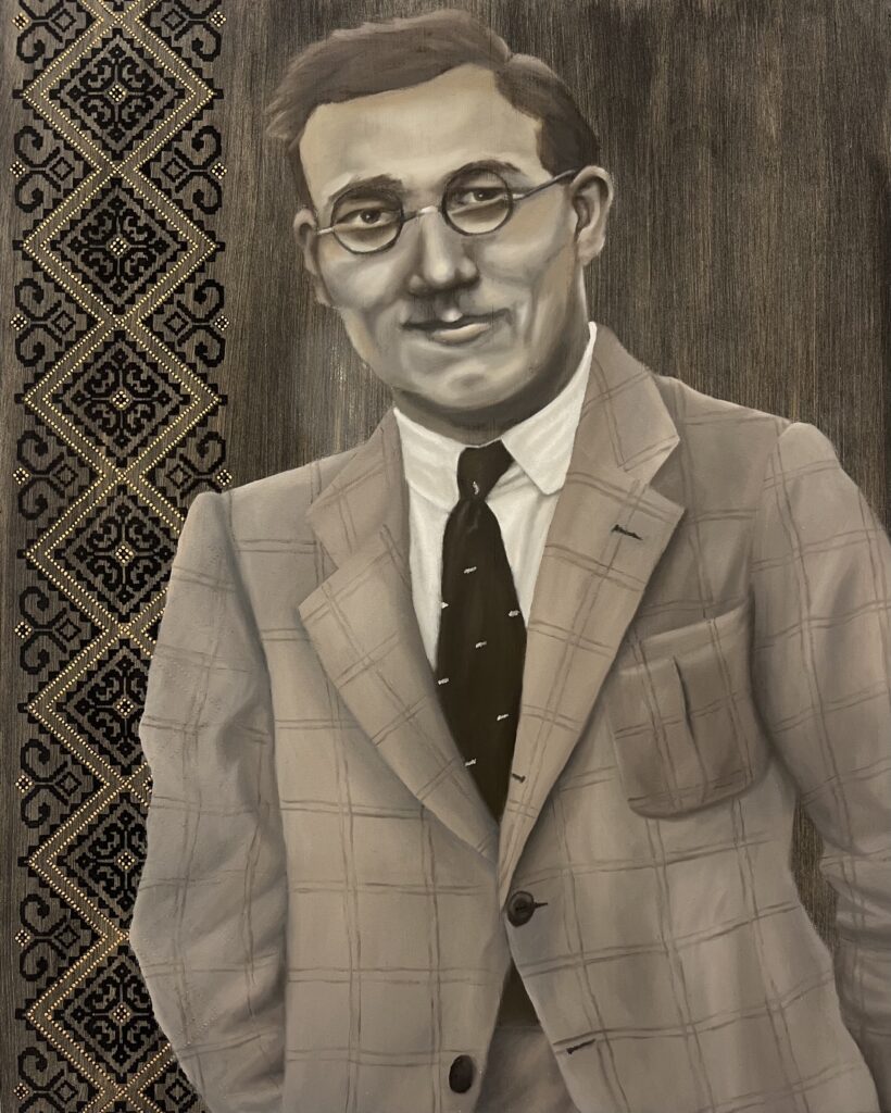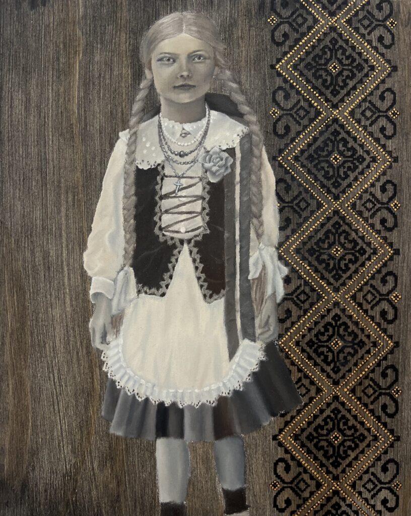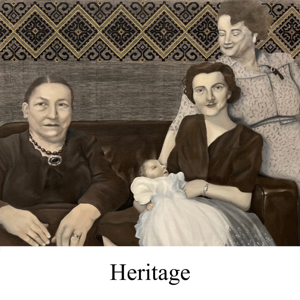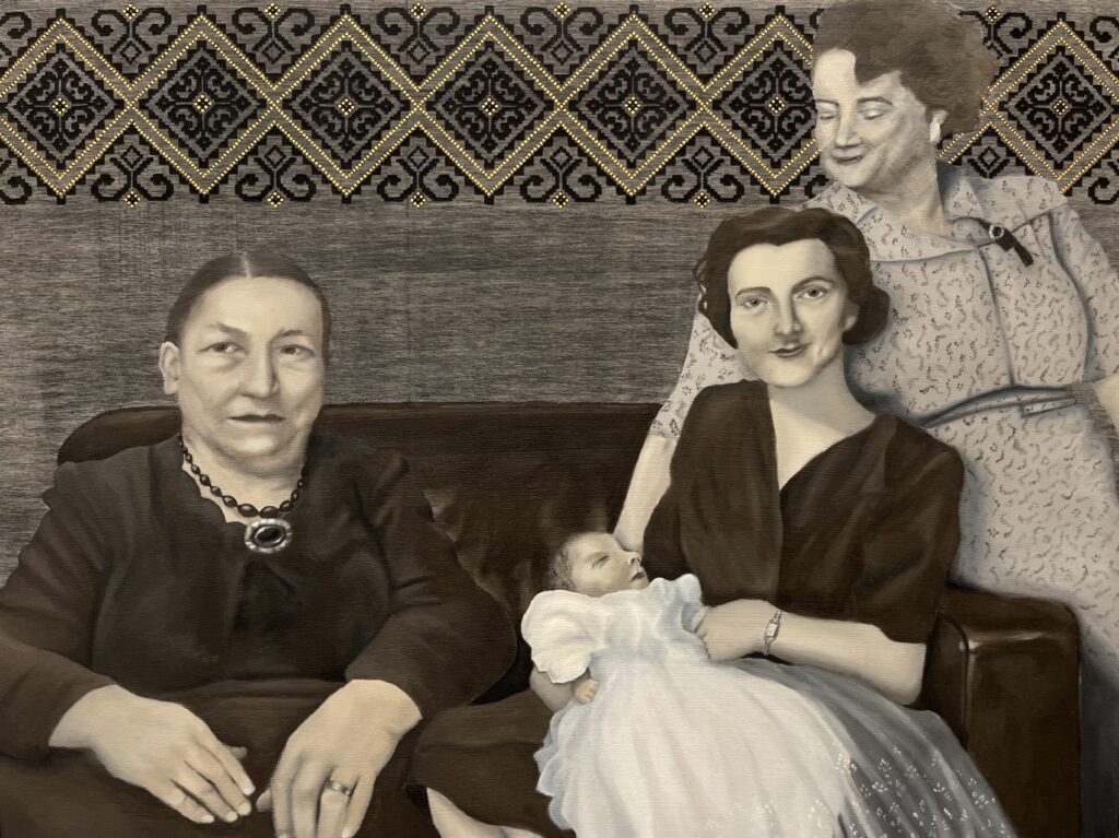 This series explores the artist’s Lithuanian heritage, each painting responds to old family photographs and includes traditional Lithuanian pattern.